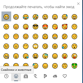 В Windows10 мы теперь можем добавлять в текст свои эмоции с помощью Эмодзи. Чтобы вызвать панель эмодзи, надо нажать на сочетание клавиш Win и точки (.) В этом случае раскладку клавиатуры тоже менять не надо. Но нажимайте на ту точку, которую используете в английской раскладке. В нижнем правом углу на экране нашего монитора появится вот такое окошко. Мы можем выбрать какие-то эмоции из представленного набора и добавить их в свой текст. 🙂